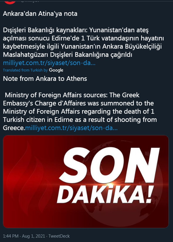 «Η Επιτετραμμένη στην Άγκυρα, κατόπιν σχετικών οδηγιών, απαντώντας σε σχετικό έκτακτο διάβημα στο οποίο κλήθηκε νωρίτερα σήμερα στο τουρκικό Υπουργείο Εξωτερικών, απέρριψε στο σύνολο τους τις τουρκικές αιτιάσεις σχετικά με φερόμενο περιστατικό στον Έβρο.