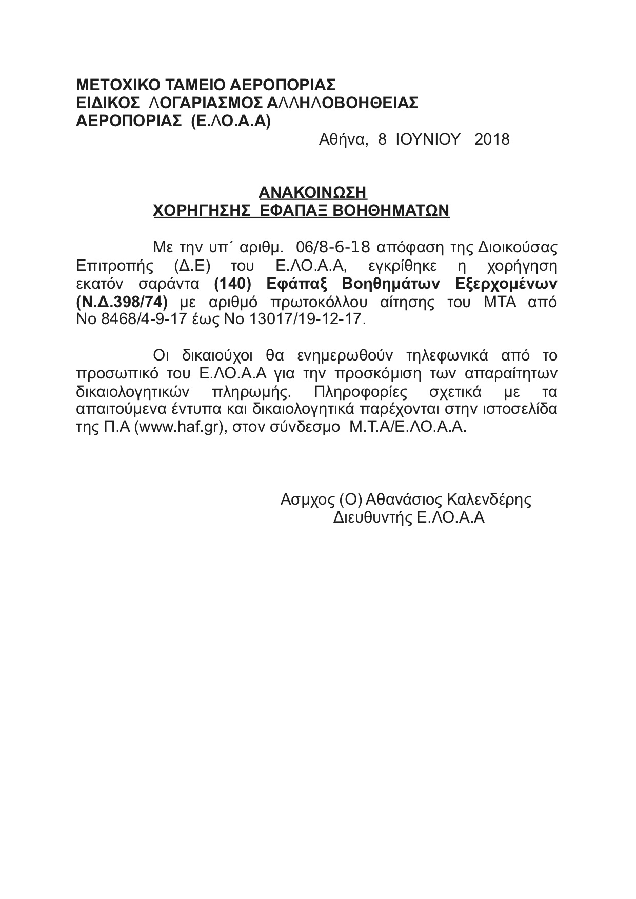 Με την υπ ́ αριθμ. 06/8-6-18 απόφαση της Διοικούσας Επιτροπής (Δ.Ε) του Ε.ΛΟ.Α.Α, εγκρίθηκε η χορήγηση εκατόν σαράντα (140) Εφάπαξ Βοηθημάτων Εξερχομένων (Ν.Δ.398/74) με αριθμό πρωτοκόλλου αίτησης του ΜΤΑ από Νο 8468/4-9-17 έως Νο 13017/19-12-17.