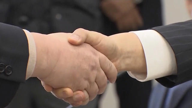 Οι εκπρόσωποι των δύο αντίπαλων κρατών, η διάθεση των οποίων φαινόταν χαλαρή, αντάλλαξαν χαμόγελα μαζί με τη χειραψία τους.