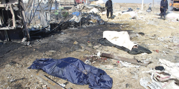 Πλάνα που προβλήθηκαν από την κρατική τηλεόραση δείχνουν πυροσβέστες να επιχειρούν να σβήσουν εστίες φωτιάς και μαύρα σύννεφα καπνού να υψώνονται πάνω από απανθρακωμένα φορτηγά και αυτοκίνητα.