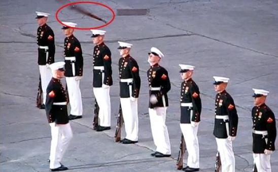 Όλα πήγαιναν καλά μέχρι που ήρθε η σειρά του πέμπτου πεζοναύτη να κάνει την επίδειξη του. Στην απόλυτη ησυχία ακούγεται μόνο ο ήχος του όπλου που σκίζει τον αέρα και που χτυπά όταν σταματάει στα χέρια του πεζοναύτη. Η χορογραφία του πέμπτου τελειώνει και πετά το όπλο του για έλεγχο. Ο επικεφαλής το τσεκάρει και του το επιστρέφει (2.30 λεπτό στο βίντεο). Όμως λίγο η αφηρημάδα του πεζοναύτη , λίγο το γεγονός ότι ο επικεφαλής έβαλε περισσότερη δύναμη από όσο έπρεπε το όπλο διαγράφει μια τροχιά πάνω από το απλωμένο χέρι του πεζοναύτη και προσγειώνεται πίσω του.