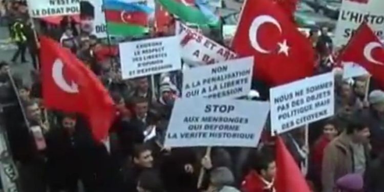 Τουλάχιστον 15.000 Ευρωπαίοι τουρκική καταγωγής, στην πλειοψηφία τους Τούρκοι που ζουν στη Γαλλία, διαδήλωσαν σήμερα στο Παρίσι για να καταγγείλουν το νομοσχέδιο που ποινικοποιεί την άρνηση της γενοκτονίας των Αρμενίων από τους Οθωμανούς το 1915, το οποίο αναμένεται να ψηφιστεί τη Δευτέρα από τη γαλλική γερουσία.