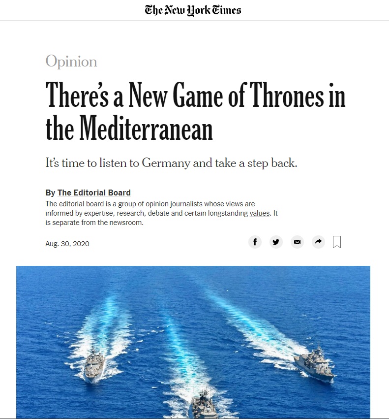 Αυτά -μεταξύ άλλων- αναφέρουν σε άρθρο γνώμης οι New York Times, υπό τον τίτλο: «Υπάρχει ένα νέο Game of Thrones στην Μεσόγειο – Ήρθε η ώρα να ακούσουμε τη Γερμανία και να κάνουμε ένα βήμα πίσω».