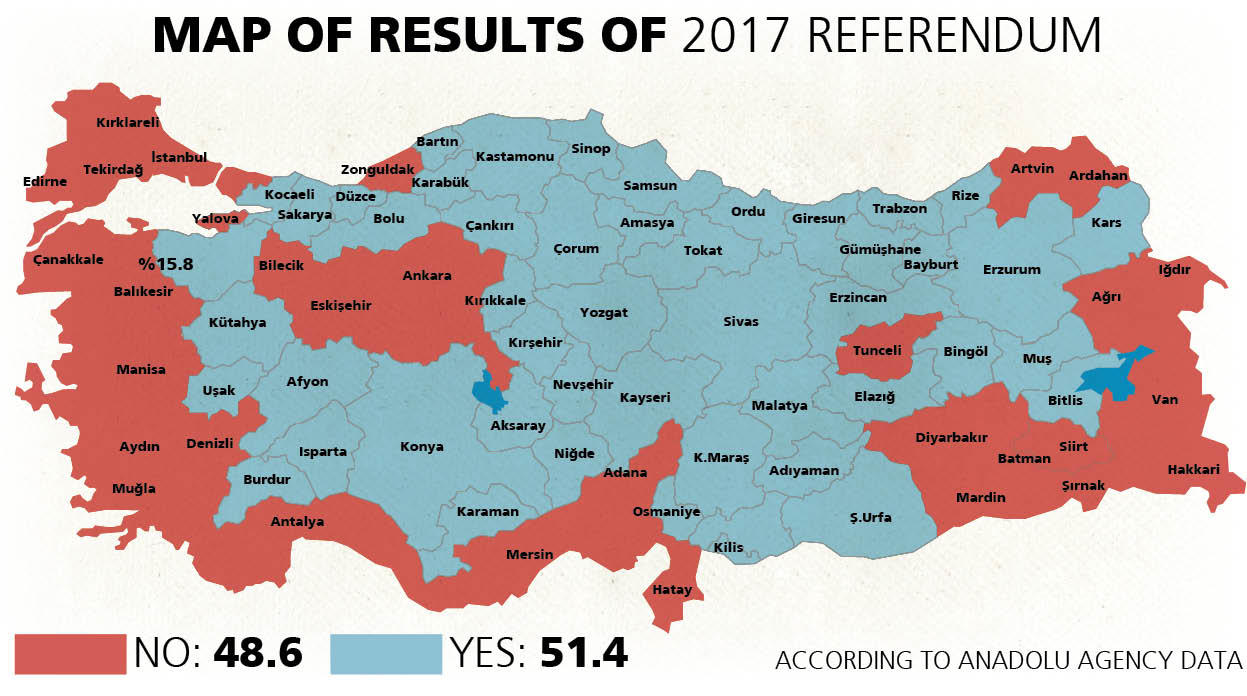 Το αποτυχημένο πραξικόπημα, του Ιουλίου του 2016, του έδωσε την ευκαιρία να εκκαθαρίσει το τοπίο από κάθε αντίπαλο και να επιβάλει τη συνταγματική αναθεώρηση, με τις ψήφους των εθνικιστών, παρά την τεράστια αντίδραση. Στο τρίτο και πιο πρόσφατο δημοψήφισμα της διακυβέρνησης του, για την αλλαγή του συντάγματος το 2017, μετά βίας απέσπασε το 51%, ενώ οι καταγγελίες για βία και νοθεία ήταν πολλές και αξιόπιστες.