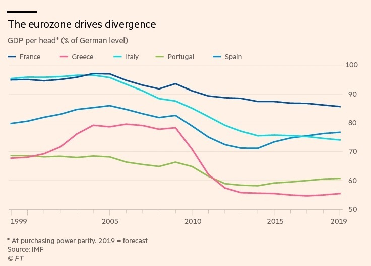 Τη χειρότερη επίδοση έχει η Ιταλία που έχασε περίπου 20% και από το 95% βρέθηκε στο 75% του γερμανικού κατά κεφαλή ΑΕΠ. Οι περισσότερες χώρες, όπως η Γαλλία, έχασαν 10% περίπου. Μόνο η Ισπανία υποχώρησε λιγότερο, περίπου 5%. Η Ελλάδα ξεκίνησε από το 68%, έφθασε το 80% στα μέσα της δεκαετίας του 2000, για να κατακρημνιστεί στη συνέχεια, με πάταγο, στο 55%, όπου και έχει καθηλωθεί από το 2013 και μετά. Η ελληνική γραμμή δεν υποχωρεί αλλά και δεν ανακάμπτει, εξαιτίας του τραγικού 2015, που ξεχαρβάλωσε το ελατήριο της οικονομίας, το οποίο παραμένει καθηλωμένο πέριξ των 180-190 δισεκατομμυρίων ευρώ ΑΕΠ ετησίως.