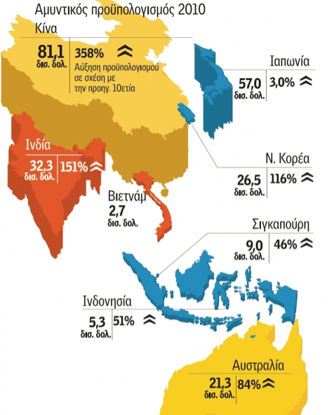 Πριν από ένα χρόνο, το SIPRI είχε στοιχεία σύμφωνα με τα οποία ο μεγαλύτερος εισαγωγέας όπλων στο κόσμο (9%), κατά στη διάρκεια της περιόδου 2005-2009, ήταν η Κίνα (ενώ σήμερα το 6%)αυξάνοντας παράλληλα τον αμυντικό της προϋπολογισμό κατά 15% (2009) επικαλούμενη μεταξύ άλλων προβλήματα ασφαλείας στο Θιβέτ.