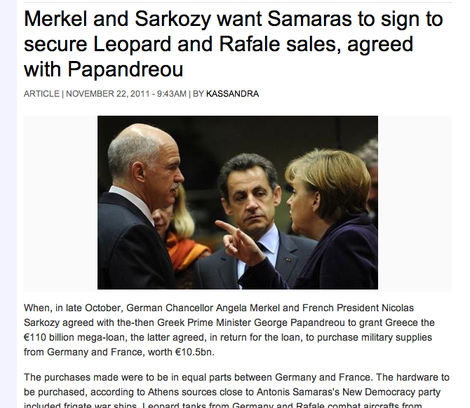 Σύμφωνα με το δημοσίευμα “όταν, στα τέλη Οκτωβρίου, η Γερμανίδα Καγκελάριος Άνγκελα Μέρκελ και ο Γάλλος πρόεδρος Νικολά Σαρκοζί συμφώνησε με τον τότε Έλληνα Πρωθυπουργό Γιώργο Παπανδρέου να χορηγήσει στην Ελλάδα € 110 000 000 000 , έθεσαν ως αντάλλαγμα για το δάνειο, την αγορά οπλικών συστημάτων από τη Γερμανία και τη Γαλλία, αξίας € 10.5 δις”!