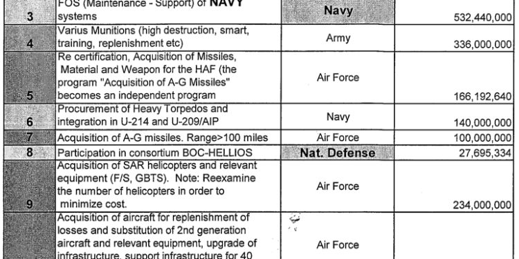 Διαβάζοντας τον πίνακα με τα 30 πρώτα προγράμματα του ελληνικού εξοπλιστικού προγράμματος,δημιουργείται το ερώτημα: τι εννοούν κυβέρνηση και αντιπολίτευση όταν λένε και ξαναλένε ότι θα κόψουν κι άλλα κονδύλια από τους εξοπλισμούς;