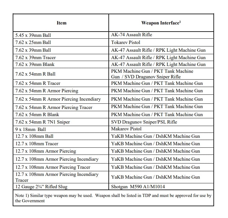 Σύμφωνα με την ανακοίνωση του US Army, η σύμβαση προβλέπει την αγορά ειδικών πυρομαχικών, εκτός πλαισίου NATO και πιο συγκεκριμένα ρωσικής κατασκευής, όπως περίστροφα, τυφέκια τύπου kalashnikov (AK-47), τυφέκια ελεύθερων σκοπευτών αλλά και πολυβόλα.