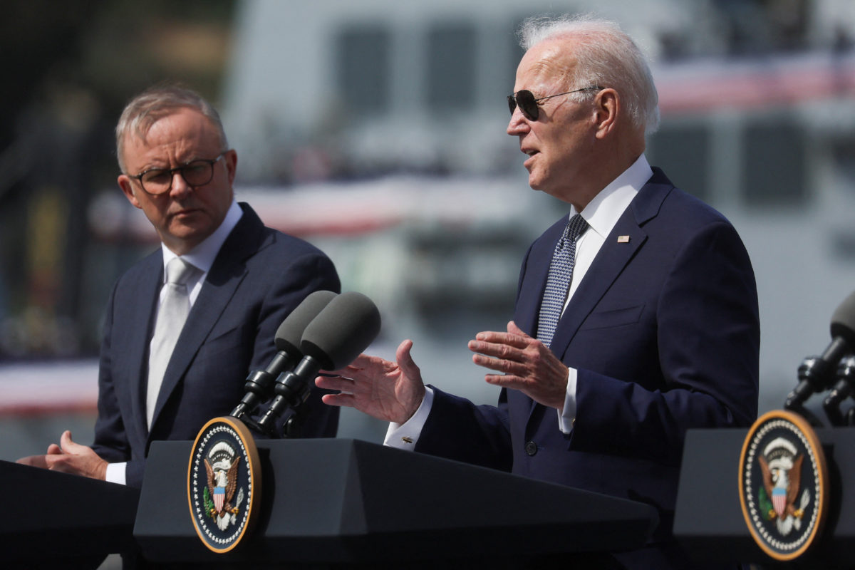 Μιλώντας σε τελετή που πραγματοποιήθηκε σε βάση του αμερικανικού Πολεμικού Ναυτικού στο Σαν Ντιέγκο της Καλιφόρνιας, παρουσία του πρωθυπουργού της Αυστραλίας Άντονι Αλμπανέζι και του Βρετανού ομολόγου του Ρίσι Σούνακ, ο Αμερικανός πρόεδρος Τζο Μπάιντεν διαβεβαίωσε ότι η χώρα του δεν θα μπορούσε να έχει «καλύτερους φίλους», εξαίροντας τη συμμαχία AUKUS. «Τοποθετούμαστε στην καλύτερη δυνατή θέση για να αντιμετωπίσουμε από κοινού τις προκλήσεις του σήμερα και του αύριο», πρόσθεσε.