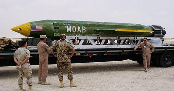 Η βόμβα BGU-43, ή MOAB (Massive Ordinance Air Blast κατά την επίσημη ονομασία της, ή Mother of All Bombs, «μητέρα όλων των βομβών», όπως αποκαλείται από Αμερικανούς στρατιωτικούς), η ισχύς της οποίας ισοδυναμεί με περίπου 11 τόνους ΤΝΤ, έπληξε την περιοχή Ατσίν της επαρχίας Νανγκαρχάρ. Συγκεκριμένα έπληξε «μια σειρά από σήραγγες» που χρησιμοποιούσε το Ισλαμικό Κράτος.