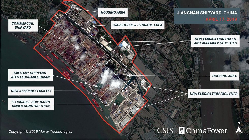 Οι εικόνες του Απριλίου, που παραδόθηκαν στο Reuters από το Κέντρο Στρατηγικών και Διεθνών Σπουδών (CSIS) της Ουάσιγκτον, αποκαλύπτουν μια αξιοπρόσεχτη πρόσφατη δραστηριότητα των Κινέζων στα ναυπηγία Jiangnan κοντά στη Σαγκάη. Πρόκειται συγκεκριμένα για ένα τεράστιο αεροπλανοφόρο υπό κατασκευή όπως φαίνεται στις φωτογραφίες.