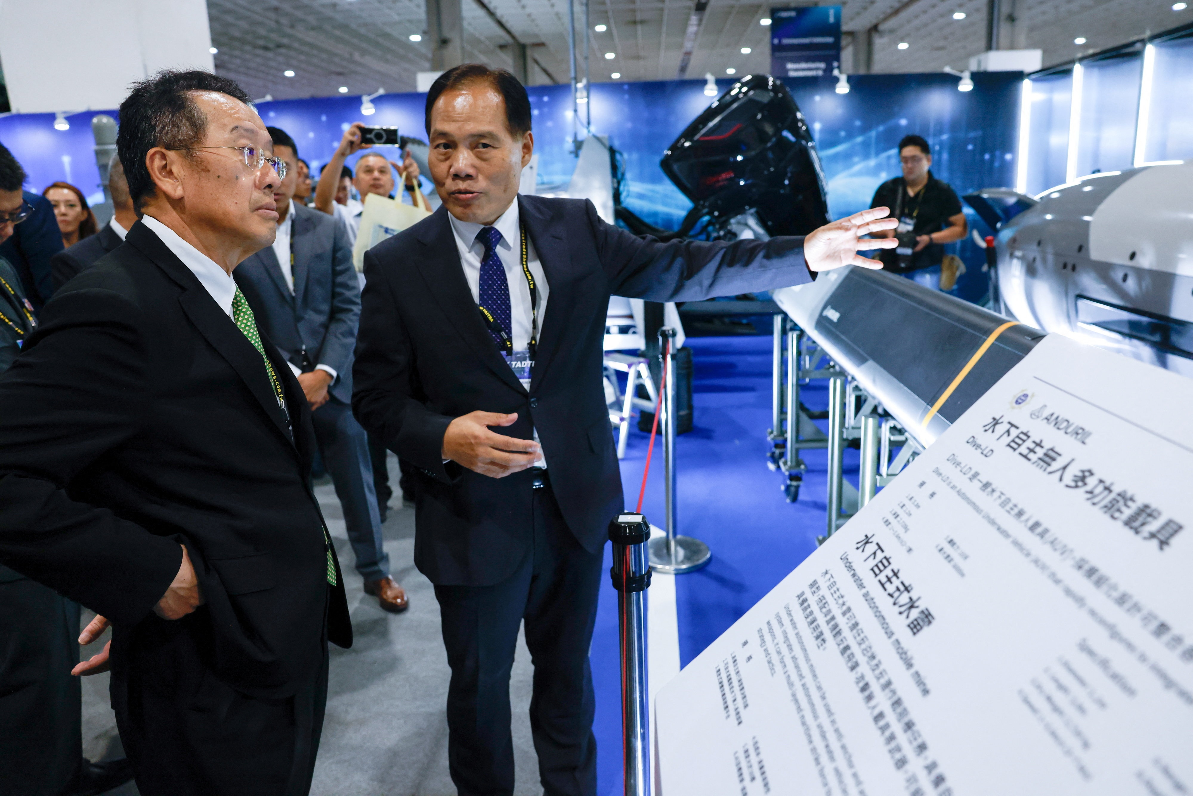 Ο υπουργός Άμυνας της Ταϊβάν μπροστά από το UUV Dive-LD και τον πύραυλο Barracuda 500 / REUTERS/Ann Wang