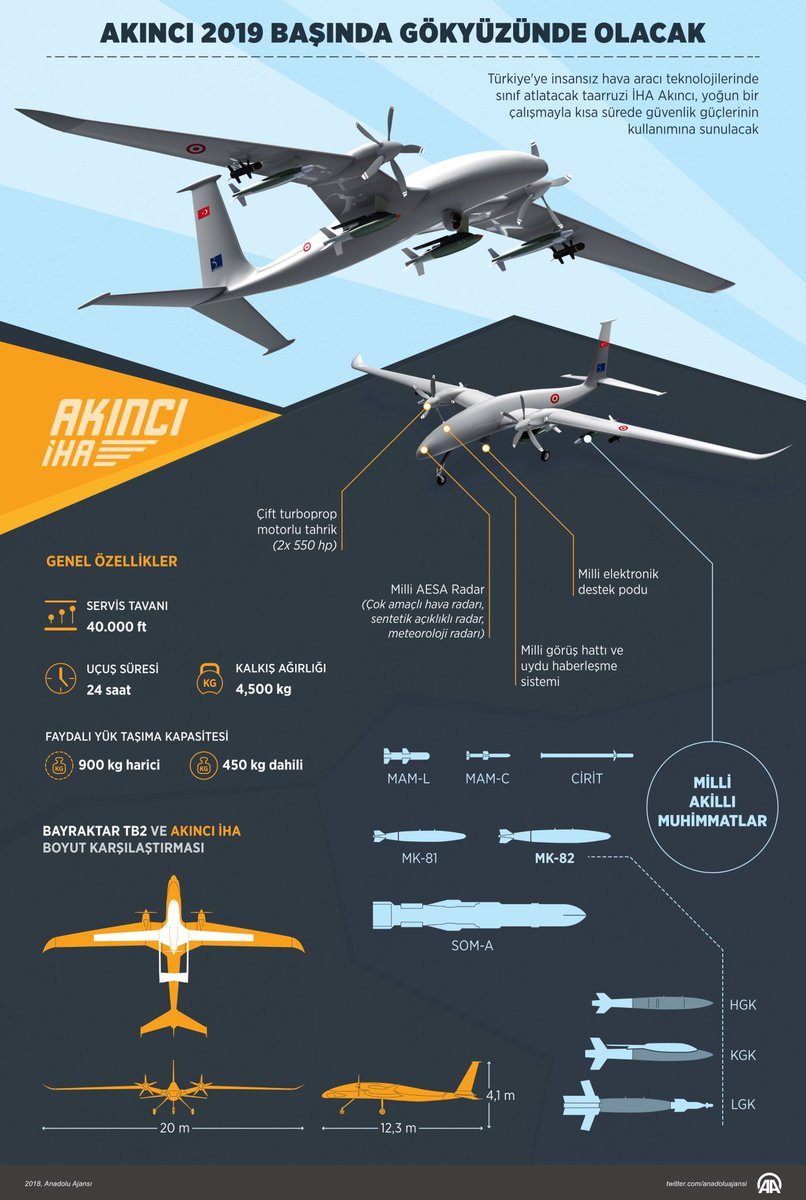 Το Akinci θα μπορεί να επιχειρήσει με προσαρμοσμένο οπλοστάσιο και πυρομαχικά, ανάλογα την αποστολή που θα εκτελεί και αναμένεται να πραγματοποιήσει την πρώτη του δοκιμαστική πτήση εντός του 2019, προκειμένου να ενταχθεί επίσημα στις τουρκικές Ένοπλες Δυνάμεις το 2020.