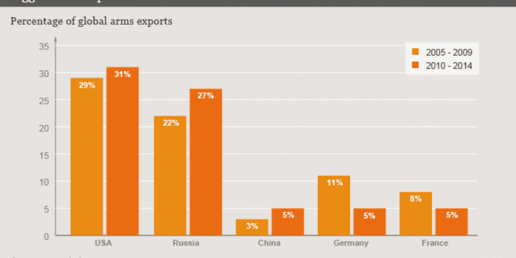 Οι ΗΠΑ παραμένουν ο μεγαλύτερος εξαγωγέας όπλων αλλά το εντυπωσιακό από τα στοιχεία του ιδρύματος SIPRI είναι η τεράστια αύξηση εξαγωγών όπλων από τη Κίνα: 143% αύξησε το Πεκίνο τις πωλήσεις όπλων εκτοπίζοντας από την τρίτη θέση παγκοσμίως την Γερμανία!