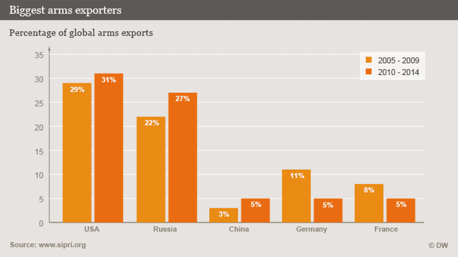 Το μεγάλο πρόβλημα το έχει η Γερμανία . Την τελευταία πενταετία οι εξαγωγές της μειώθηκαν κατά 43%. Σύμφωνα με την DW πάντως το 2014 η Γερμανία είχε σηματικές παραγγελίες “από τις χώρες της Εγγύς Ανατολής. Σημαντικότεροι αγοραστές γερμανικών όπλων είναι οι ΗΠΑ με 11%, το Ισραήλ με 9 % και η Ελλάδα με 7 %”.