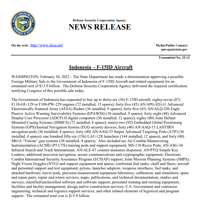 Μπορεί η Ινδονησία να βρέθηκε χθες στο «επίκεντρο της προσοχής» των διεθνών αμυντικών μέσων ενημέρωσης λόγω της τεράστιας συμφωνίας που υπέγραψε με τη Γαλλία τόσο για την προμήθεια 42 μαχητικών αεροσκαφών Rafale όσο και για την εκδήλωση ενδιαφέροντος να αποκτήσει δύο γαλλικά υποβρύχια κλάσσης Scorpene, όμως φαίνεται πως οι Αμερικανοί δεν είπαν «την τελευταία τους λέξη» και κάνουν «ρελάνς» με τα μαχητικά F-15EX.