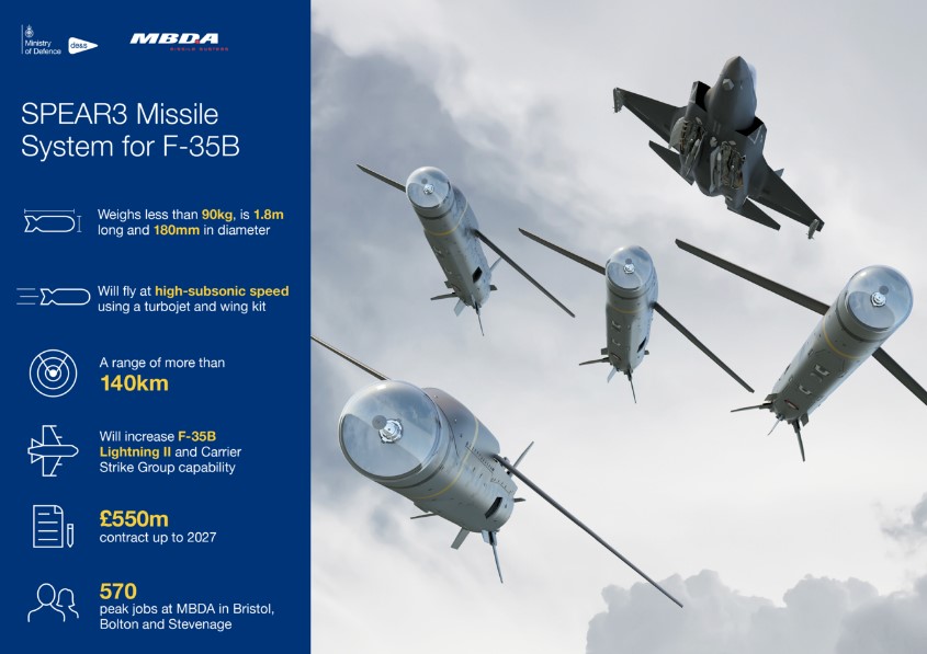 Σύμφωνα με όσα έγιναν γνωστά, η εταιρεία MBDA, η οποία επίσης και κατασκευάζει τους περίφημους πυραύλους Meteor που ευελπιστούν να προμηθευτούν τα ελληνικά μαχητικά Rafale, υπέγραψε συμφωνία με το βρετανικό Υπουργείο Άμυνας αξίας 746 εκατομμυρίων δολαρίων για την παραγωγή και την προμήθεια των πυραύλων SPEAR για τη βρετανική Βασιλική Πολεμική Αεροπορία.