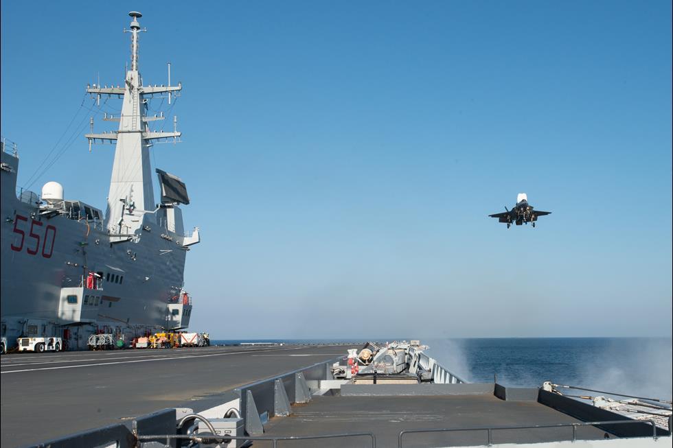 Ένα F-35B προσγειώνεται στο ITS Cavour του Ιταλικού Ναυτικού.