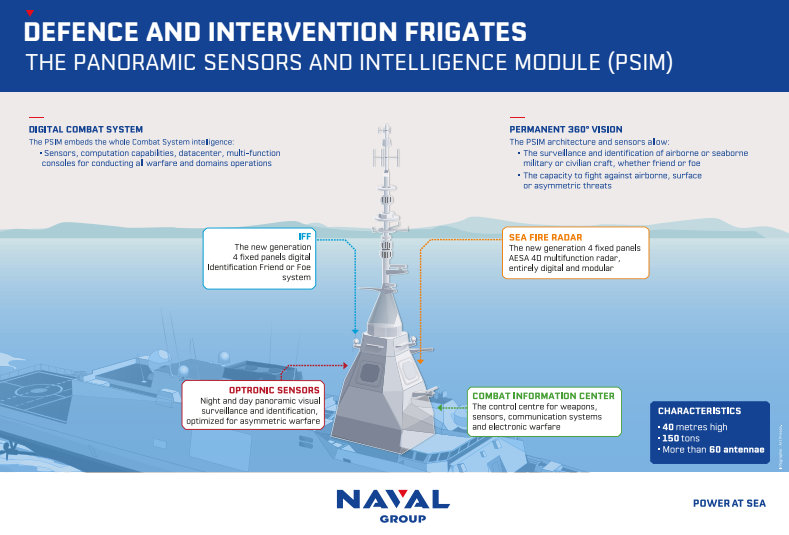 Επίσης, στο PSIM ενσωματώνονται τα Sea Fire Radars, τέσσερα νέας γενιάς σταθερά πάνελ AESA, πολλαπλών λειτουργιών και εξ ολοκλήρου ψηφιακών καθώς και το Κέντρο Πληροφοριών Μάχης, που λειτουργεί ως κέντρο ελέγχου όπλων, αισθητήρων αλλά και συστημάτων επικοινωνίας και ηλεκτρονικού πολέμου.