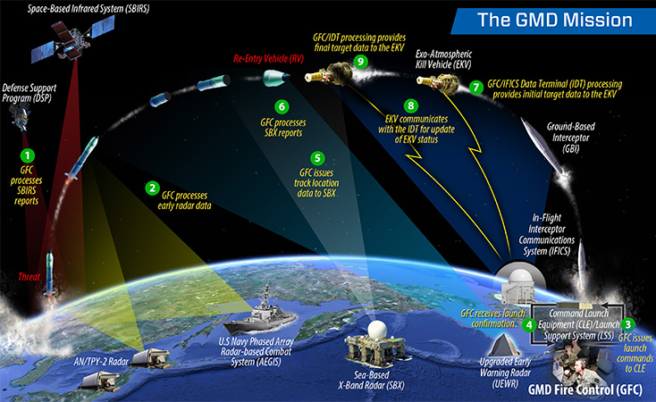 Σύμφωνα με δήλωση του Missile Defence Agency των ΗΠΑ “δύο πύραυλοι τύπου GMD (Ground Midcourse Defence) εκτοξεύθηκαν, με μικρή χρονική διαφορά μεταξύ τους, τη Δευτέρα από την βάση Vandenberg της Πολεμικής Αεροπορίας στην Καλιφόρνια,με σκοπό την αναχαίτιση ενός προσομοιωμένου διηπειρωτικού βαλλιστικού πυραύλου που εκτοξεύθηκε από μια τοποθεσία δοκιμών στη νήσο Kwajalein στον Ειρηνικό” , φωτογραφίζοντας έτσι ενδεχόμενη απειλή από την Κίνα.