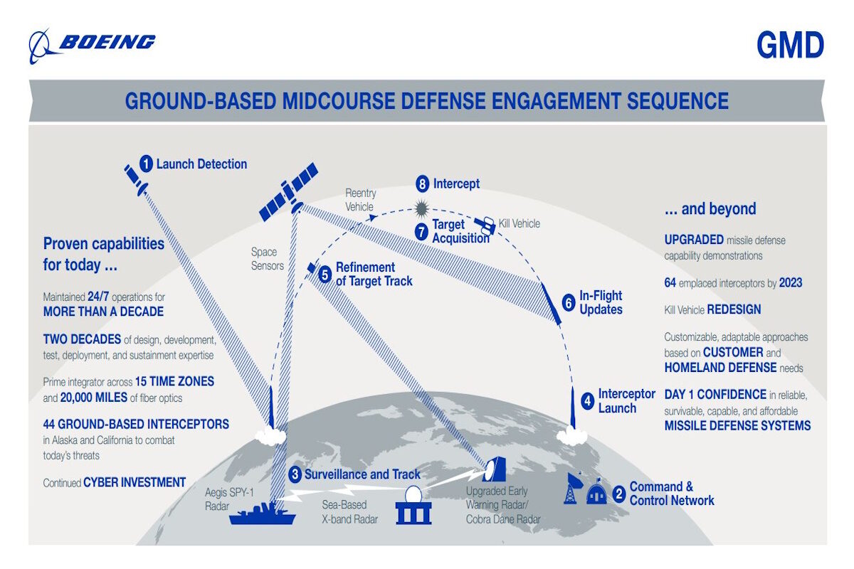 Το GMD (Ground-Based Midcourse Defense), που εξουδετερώνει πυραύλους μεγάλης εμβέλειας στο μέσο της πλοήγησης τους ενώ είναι σε διαστημική τροχιά (midcourse phase), η διαδικασία φαίνεται στο παραπάνω γράφημα.