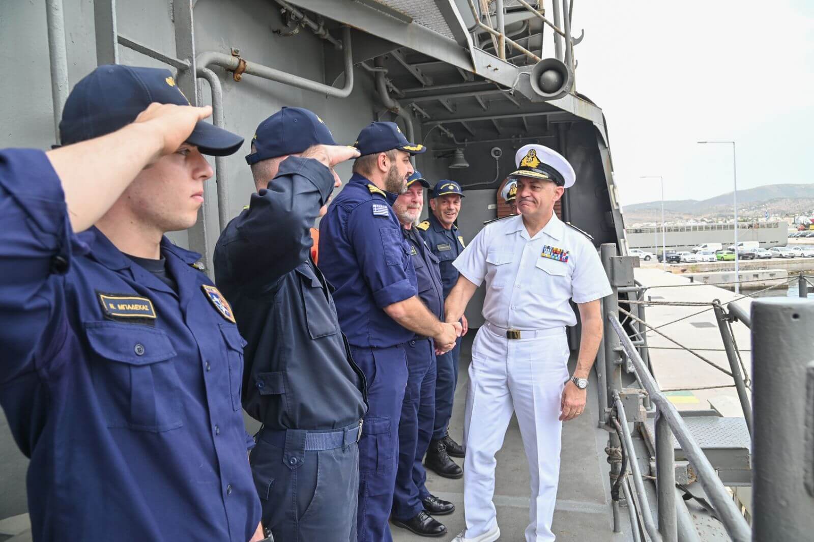 Μετά τον κατάπλου της φρεγάτας στον Ναύσταθμο, ο Αρχηγός ΓΕΝ Αντιναύαρχος Δημήτριος – Ελευθέριος Κατάρας ΠΝ, επέβη στο πλοίο συνοδευόμενος από τον Αρχηγό Στόλου Αντιναύαρχο Πολυχρόνη Κουλούρη ΠΝ και καλωσόρισαν τον Κυβερνήτη καθώς και το πλήρωμα της Φ/Γ, συγχαίροντας τους για την επιτυχή ολοκλήρωση της αποστολής.