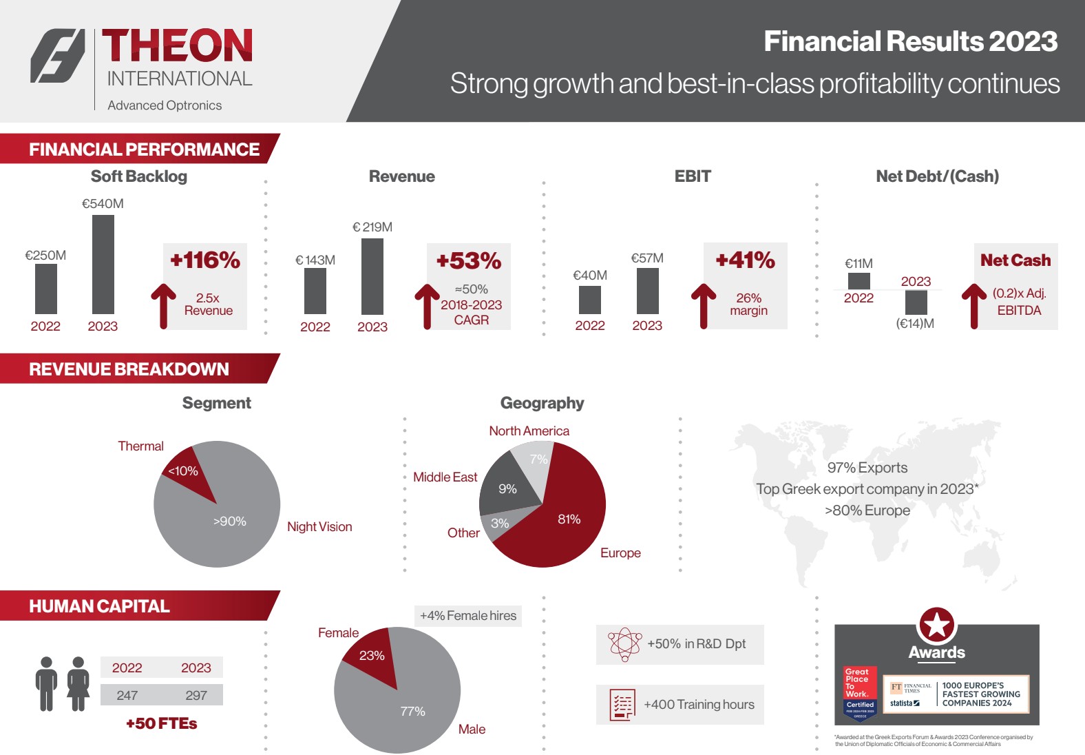 Η ΤΗΕΟΝ INTERNATIONAL PLC (THEON), κορυφαίος κατασκευαστής συστημάτων νυχτερινής όρασης και θερμικής απεικόνισης για αμυντικές εφαρμογές και εφαρμογές ασφαλείας με παγκόσμιο αποτύπωμα, ανακοινώνει σήμερα τα οικονομικά της αποτελέσματα για το σύνολο του έτους 2023. Επιδεικνύοντας ανθεκτικότητα, προσαρμοστικότητα και δέσμευση στην καινοτομία, η THEON σημείωσε μεγάλη επιτυχία, ξεπερνώντας τις προσδοκίες και θέτοντας νέα σημεία αναφοράς στον κλάδο.