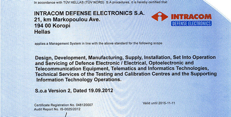 Η πιστοποίηση σύμφωνα με το ISO 27001:2005 είναι σημαντικό επίτευγμα για την εταιρία και δείχνει ότι υιοθετεί άμεσα τις σύγχρονες τεχνολογικές εξελίξεις. Υπογραμμίζει τη δέσμευση της INTRACOM Defense Electronics σε θέματα ασφάλειας πληροφοριών και αποτελεί έμπρακτη απόδειξη προς τους συνεργάτες και πελάτες της ότι η εξασφάλιση του απορρήτου, της διαθεσιμότητας και της ακεραιότητας των πληροφοριών που διαχειρίζεται είναι κορυφαία προτεραιότητα της.