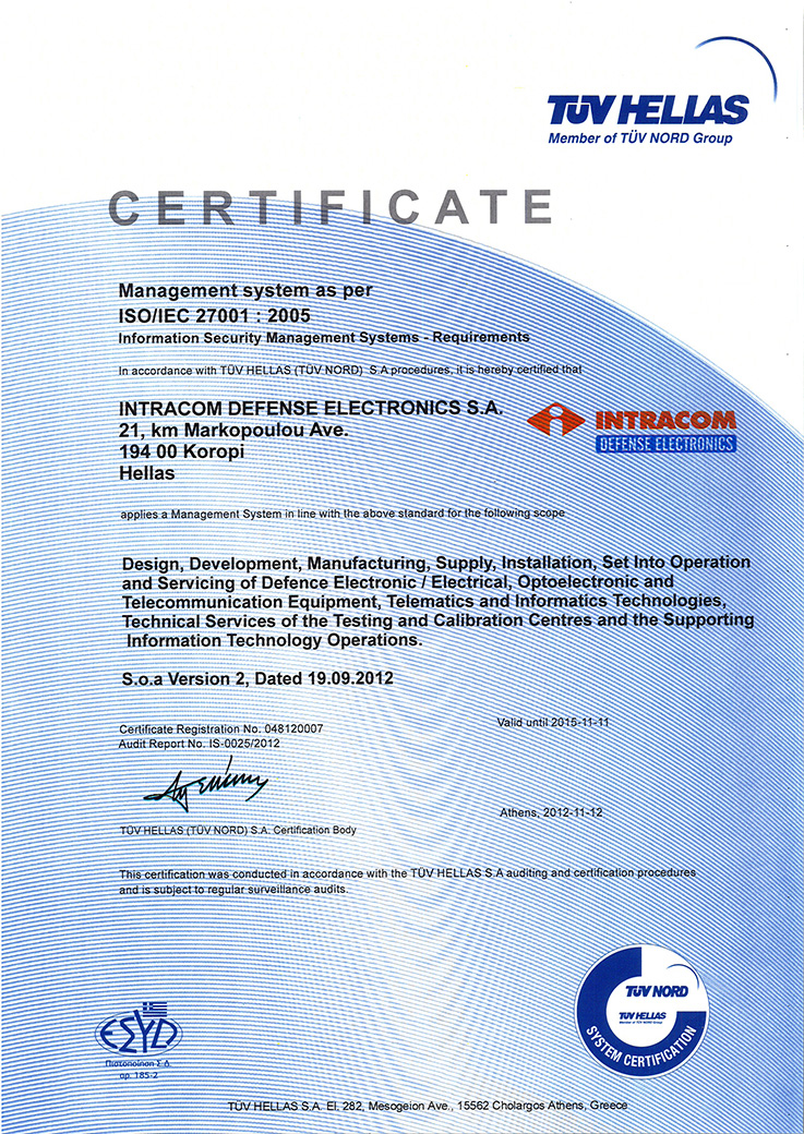Η πιστοποίηση σύμφωνα με το ISO 27001:2005 είναι σημαντικό επίτευγμα για την εταιρία και δείχνει ότι υιοθετεί άμεσα τις σύγχρονες τεχνολογικές εξελίξεις. Υπογραμμίζει τη δέσμευση της INTRACOM Defense Electronics σε θέματα ασφάλειας πληροφοριών και αποτελεί έμπρακτη απόδειξη προς τους συνεργάτες και πελάτες της ότι η εξασφάλιση του απορρήτου, της διαθεσιμότητας και της ακεραιότητας των πληροφοριών που διαχειρίζεται είναι κορυφαία προτεραιότητα της.