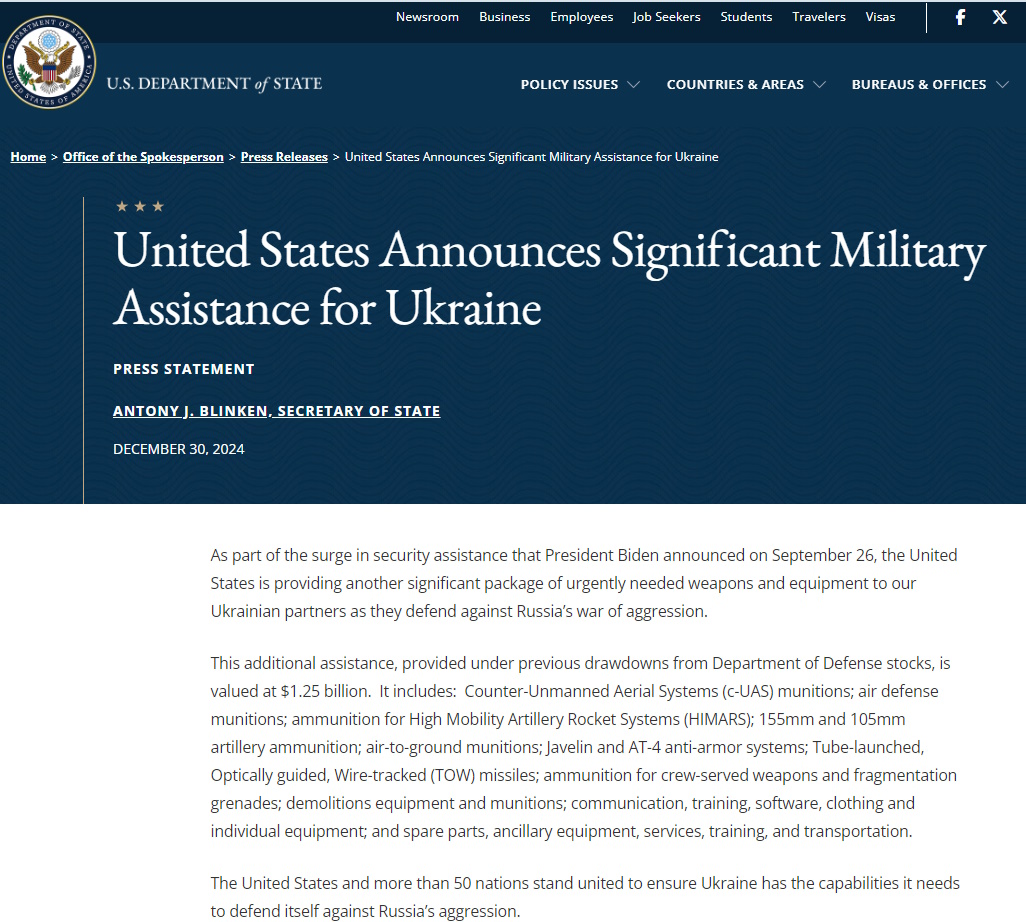 Ο Πρόεδρος των ΗΠΑ Τζο Μπάιντεν ανακοίνωσε σήμερα 30.12.2024 πρόσθετη βοήθεια ασφαλείας 2,5 δισεκατομμυρίων δολαρίων για την Ουκρανία, καθώς χρησιμοποιεί τις τελευταίες εβδομάδες του στην προεδρία για να αυξήσει τη στρατιωτική βοήθεια προς το Κίεβο πριν αναλάβει καθήκοντα ο εκλεγμένος πρόεδρος Ντόναλντ Τραμπ.