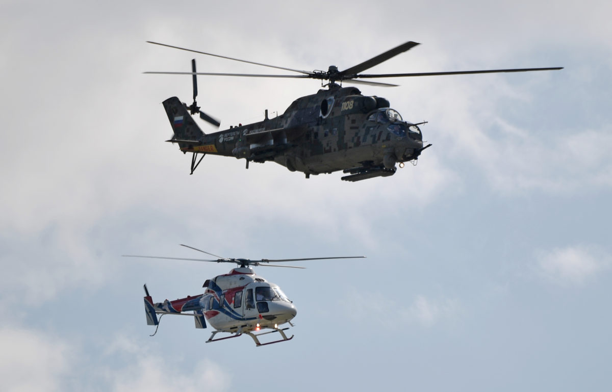 Ελικόπτερο Ansat και Mil Mi-24 πετούν σε σχηματισμό.