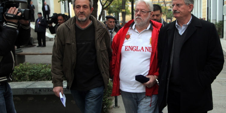 Δεμένοι με τις ίδιες χειροπέδες οδηγήθηκαν στην Ευελπίδων οι συλληφθέντες Σωτήρης Εμμανουήλ και Ιωάννης Μπέλτσιος.