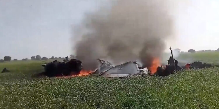 Βίντεο από τη συντριβή δείχνουν τα συντρίμμια του Mirage 2000, τα οποία έχουν πιάσει φωτιά, σκορπισμένα σε ένα χωράφι με εκατοντάδες ανθρώπους συγκεντρωμένους στο σημείο.