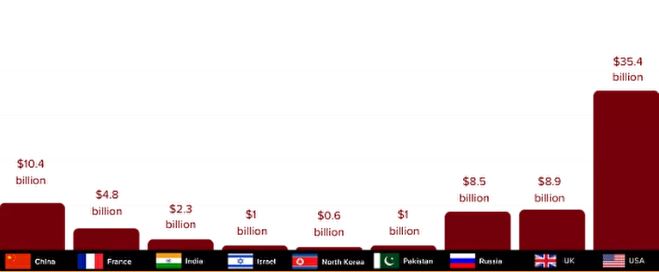 Ακολούθησαν η Ρωσία με 8,5 δισ. δολάρια, η Γαλλία με 4,8 δισ. δολάρια, η Ινδία με 2,3 δισ. δολάρια, το Ισραήλ και το Πακιστάν με 1 δισ. δολάρια και η Βόρεια Κορέα με 600 εκατ. δολάρια.