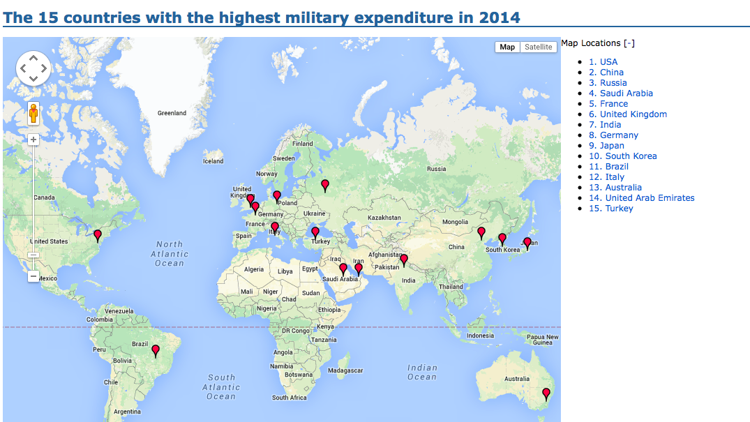 Ο χάρτης που δημοσιεύουμε είναι από το SIPRI, και δείχνει τις 15 χώρες του κόσμου που δαπανούν τα περισσότερα χρήματα στους εξοπλισμούς.Τα στοιχεία είναι του 2014.