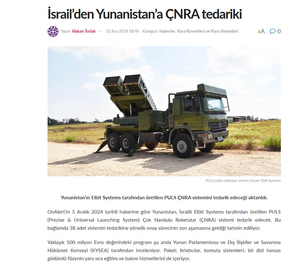 Την ώρα που το πρόγραμμα απόκτησης των ισραηλινής κατασκευής Πολλαπλών Εκτοξευτών Πυραύλων τύπου PULS βρίσκεται ένα βήμα πριν φτάσει προς έγκριση στην αρμόδια επιτροπή της Βουλής, η είδηση που αποκάλυψε το OnAlert.gr ήδη απασχολεί έντονα τα τουρκικά Μέσα Ενημέρωσης.