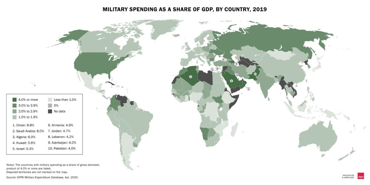 Ωστόσο οι στρατιωτικές δαπάνες πιθανόν έφθασαν πέρυσι στην κορύφωσή τους και θα μειωθούν σημαντικά φέτος, με δεδομένο τον τεράστιο οικονομικό αντίκτυπο της πανδημίας του νέου κορονοϊού.