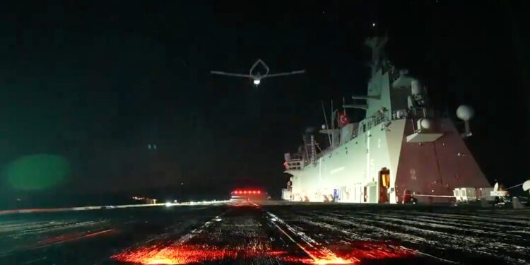«Παρά τις κακές συνθήκες ορατότητας τη νύχτα, το UCAV κατάφερε να ευθυγραμμίσει με επιτυχία την τροχιά του με το κατάστρωμα», όπως αναφέρουν τα τουρκικά μέσα.