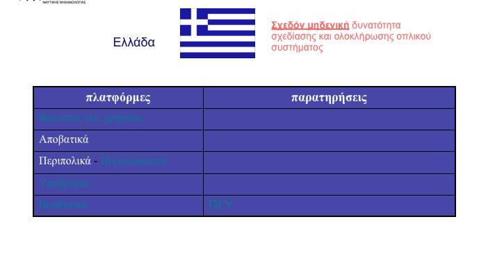 Για όσους έχουν τις αμφιβολίες τους όχι αδικαιολόγητα παρουσιάζουμε ένα μέρος της παρουσίασης που έγινε τις πρώτες ημέρες του Ιουνίου στο Πολεμικό Μουσείο για τη σχεδίαση εθνικού πλοίου. Όπως θα διαπιστώσετε όλες οι χώρες συζητάνε ,σχεδιάζουν και κάποιες κατασκευάζουν δικές τους ναυτικές πλατφόρμες. Η μόνη χώρα που συστηματικά…απέχει από κάθε τέτοια προσπάθεια είναι η Ελλάδα.