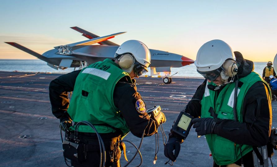 Το MQ-25 Stingray της Boeing, το οποίο φαίνεται στις φωτογραφίες πάνω στο αμερικανικό αεροπλανοφόρο, θα ανεφοδιάζει τα μαχητικά αεροσκάφη στον αέρα και θα παρέχει περιορισμένες δυνατότητες πληροφοριών, επιτήρησης και αναγνώρισης.