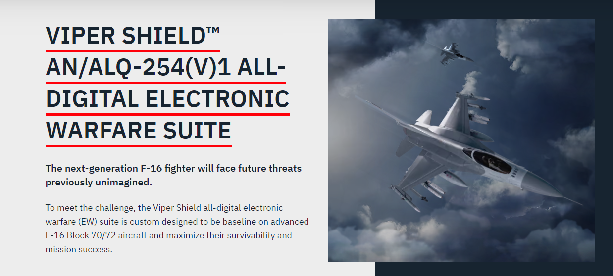 Tο νέο AN/ALQ-254(V)1 Viper Shield είναι σχεδιασμένο για τα μαχητικά F-16 Block 70/72. Ο προηγμένος ψηφιακός δέκτης προειδοποίησης ραντάρ (DRWR) ενσωματώνεται άψογα με το νέο ραντάρ APG-83 του αεροσκάφους με ενεργή ηλεκτρονική σαρωμένη συστοιχία (AESA) για μεγαλύτερη επίγνωση της κατάστασης. Το σύστημα παρεμβολής που βασίζεται σε ψηφιακή μνήμη ραδιοσυχνοτήτων (DRFM) παρέχει βελτιωμένη ικανότητα έναντι προηγμένων απειλών, όπως υποστηρίζει η εταιρεία.