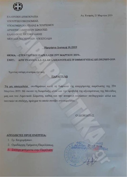 Με την διαταγή -που έφεραν στο φως της δημοσιότητας τα «Παραπολιτικά»- ο Διοικητής παραγγέλλει την «μη απαγγελία συνθημάτων» κατά την παρέλαση της 25ης Μαρτίου.