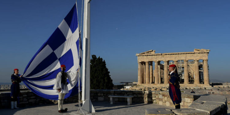 Όσοι βρέθηκαν το πρωί στον Ιερό Βράχο κοίταζαν με θαυμασμό και δέος τα μέλη της Προεδρικής Φρουράς να υψώνουν στον ιστό την γαλανόλευκη.