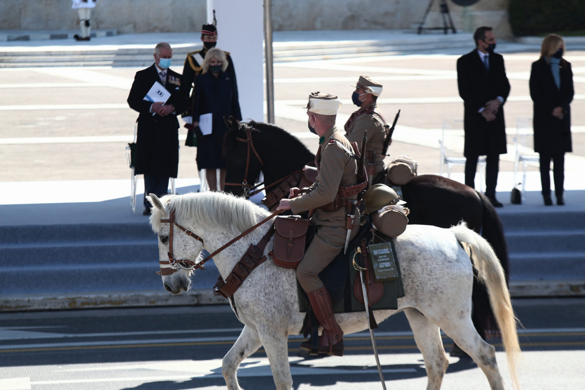 Τηρώντας τους υγειονομικούς κανόνες και τηρώντας τις απαραίτητες αποστάσεις, στην εξέδρα των επισήμων βρίσκονται, πέρα από την Πρόεδρο, τον πρωθυπουργό, τον αρχηγό της αξιωματικής αντιπολίτευσης και μέλη της κυβέρνησης, ο Πρόεδρος της Κύπρου Νίκος Αναστασιάδης, ο πρωθυπουργός της Ρωσίας Μιχαήλ Μισούστιν, ο διάδοχος του βρετανικού θρόνου πρίγκιπας Κάρολος με τη δούκισσα της Κορνουάλλης και η υπουργός Αμυνας της Γαλλίας Φλωράνς Παρλί. Το «παρών» δίνουν ακόμη ο περιφερειάρχης Αττικής Γιώργος Πατούλης, ο δήμαρχος Αθηναίων Κώστας Μπακογιάννης, κ.α.