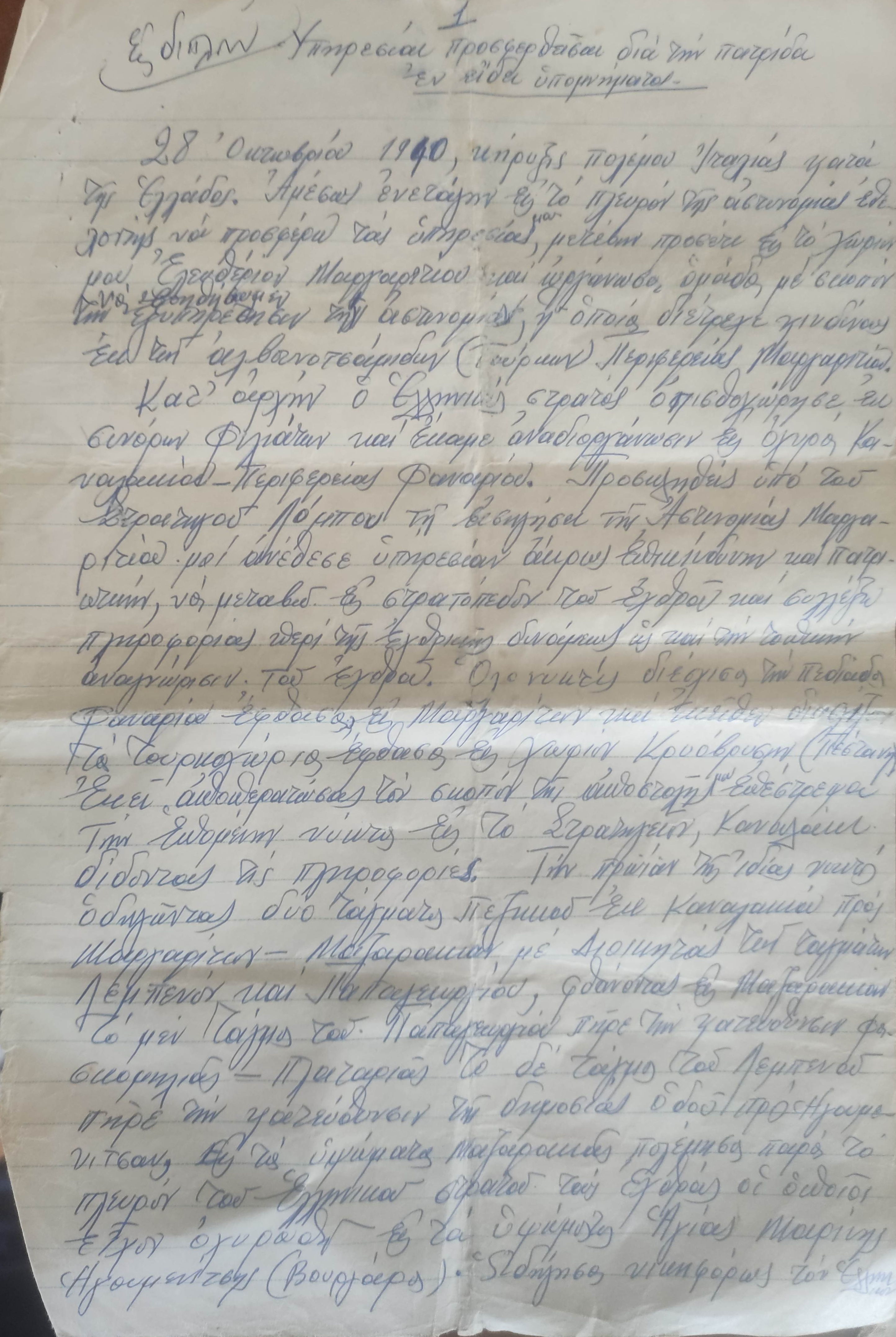 «…Την 6η Απριλίου οπισθοχωρήσαμε με αποτέλεσμα την υποδούλωσιν της πατρίδας μου. Πριν ακόμη η στυγνή σκλαβιά σκεπάσει όλη την Ελλάδα και λουσμένος μέσα εις τα νάματα του πατριωτισμού, έλαβον την απόφασιν να μην παραδώσω με το χέρι μου όπλο Ελληνικό εις τους εχθρούς-Ιταλούς….».