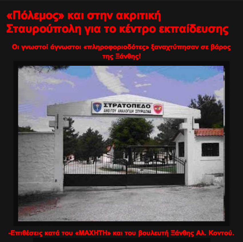 Σφόδρα ενοχλήθηκε η εφημερίδα Μαχητής της Θράκης ,από το δημοσίευμα του Onalert,για το στρατόπεδο Αναλογίδη στην Ξάνθη ,την επαναλειτουργία του οποίου ανακοίνωσε με πρωτοσέλιδο ρεπορτάζ της. Και αποδίδοντας τα εύσημα στον βουλευτή Α.Κοντό.