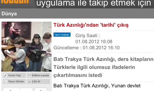 « Ιστορική «έφοδος» από την τουρκική μειονότητα» είναι ο τίτλος της Sabah, η οποία αναφέρει πως «η Τουρκική μειονότητα της Δυτικής Θράκης, ζήτησε την εξάλειψη των αρνητικών στοιχείων εναντίον των Τούρκων , από τα σχολικά βιβλία»