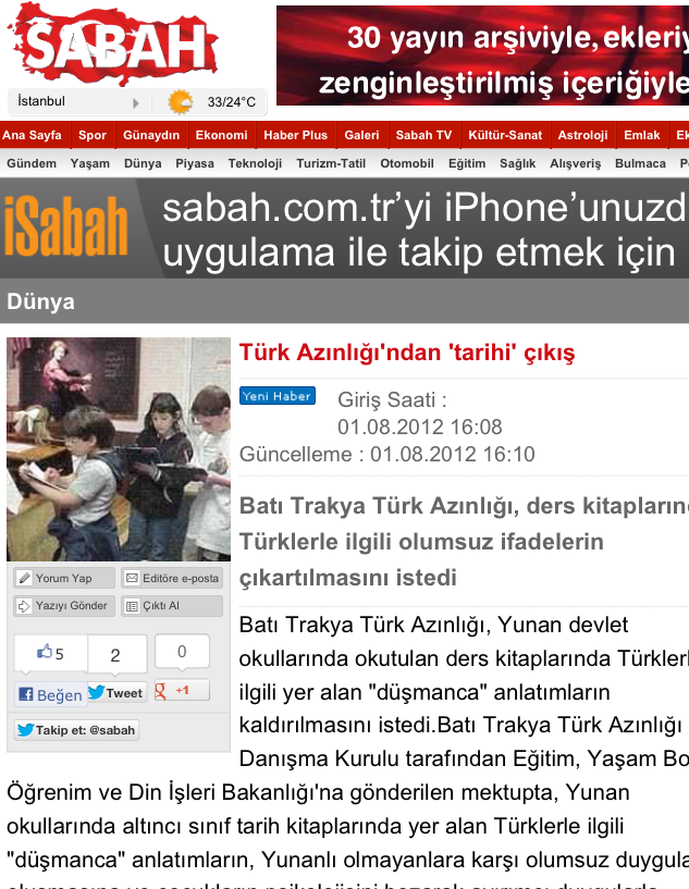 « Ιστορική «έφοδος» από την τουρκική μειονότητα» είναι ο τίτλος της Sabah, η οποία αναφέρει πως «η Τουρκική μειονότητα της Δυτικής Θράκης, ζήτησε την εξάλειψη των αρνητικών στοιχείων εναντίον των Τούρκων , από τα σχολικά βιβλία»
