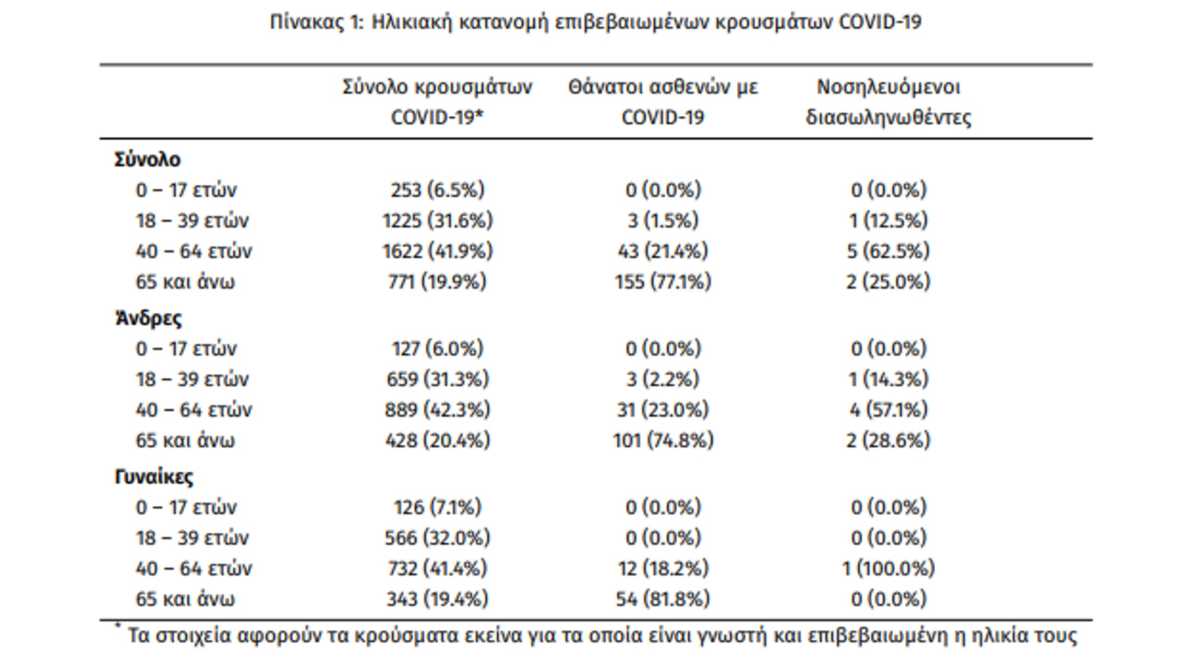 Η μέση ηλικία των κρουσμάτων είναι 47 έτη (εύρος 0 έως 102 ετών), ενώ η μέση ηλικία των θανάτων είναι 76 έτη (εύρος 35 έως 102 ετών). Η ηλικιακή κατανομή των (α) συνολικών κρουσμάτων, (β) των περιστατικών που κατέληξαν σε θάνατο και (γ) των ασθενών που νοσηλεύονται διασωληνωμένοι, είναι η ακόλουθη: